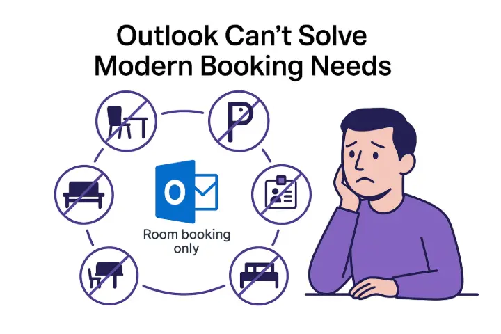 Booking systems are built for resource logistics, workplace rules, occupancy, check-in, visitors, desks, parking and hybrid coordination - none of which Microsoft Exchange, Outlook or Teams can handle natively alone.
