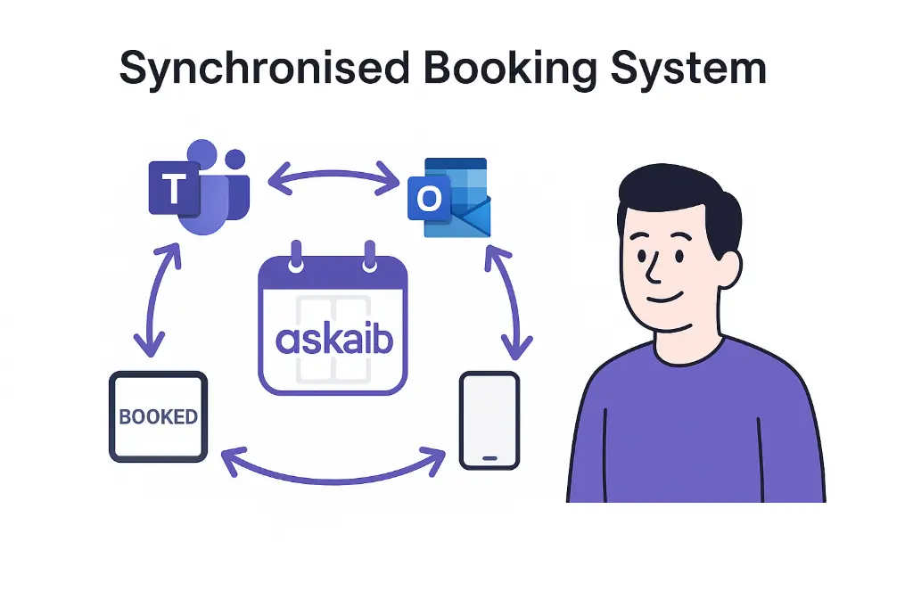 With robust, reliable real-time two-way Exchange synchronisation, askAiB keeps Teams, Outlook, Exchange, mobile, room tablets and web aligned.