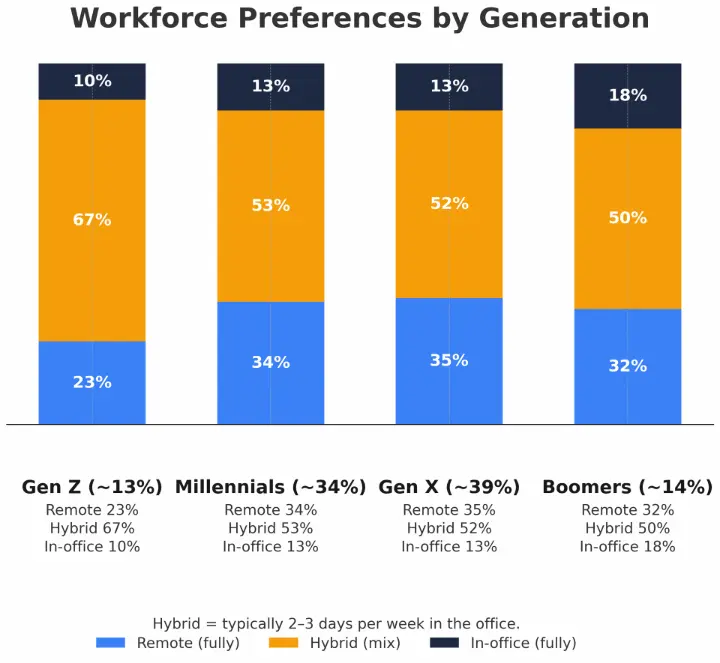 People who have been working largely remotely or in the office only a day or two per week don’t see “collaboration” as sufficient reasoning to increase time in the office, their experience is something else entirely. They view hybrid or remote work as being proven. And it's complex - because the workforce is made up of multiple generations with different wants and needs.