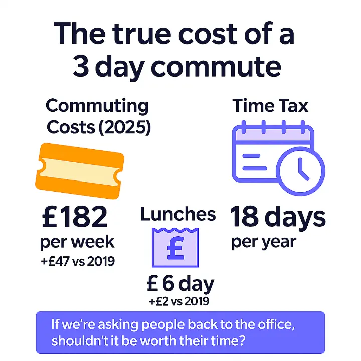 💰Increased Expenditure: The same 3-day office week that might have cost ~£5,675/year in 2019 now costs ~£7,865/year - a 38% increase!