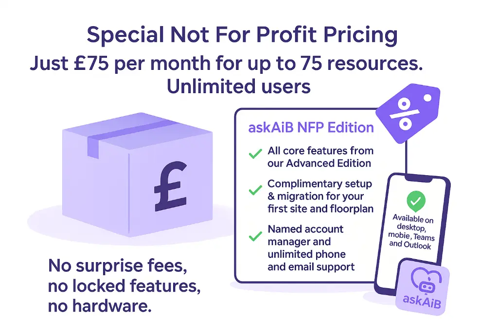 AskAiB makes it easy to manage and book desks, meeting rooms, parking, and visitors - all fully integrated with Microsoft Exchange and Teams, with UK-based support and analytics included as standard. It’s quick to deploy, effortless to maintain, and designed for real-world use where time and resources are tight.